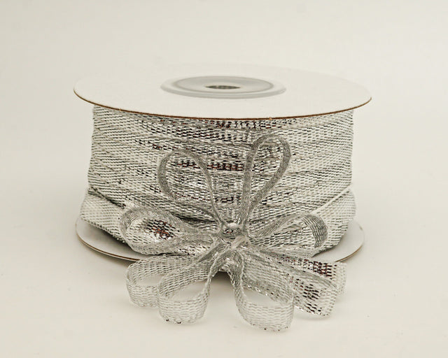 A luxurious metallic silver organza ribbon with a shimmering iridescent edge, ideal for adding a touch of sophistication to any gift or decoration.