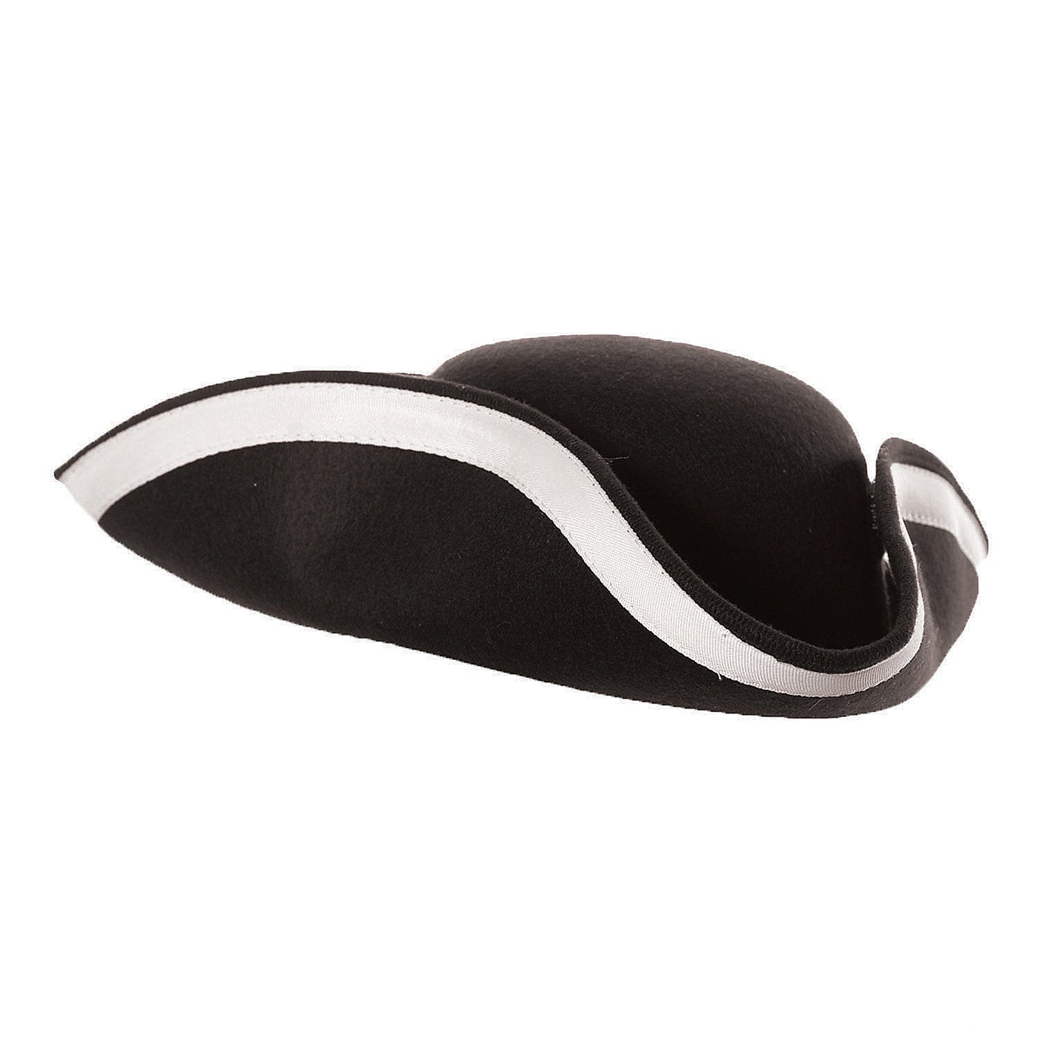 Top off your Colonial or 18th century look with the Tri Corner Hat. This tricorn hat is the perfect finishing touch to your pirate captain, American revolution or colonial pilgrim character. The Tri Corner Ribbon Adult Hat features a colonial style black three-cornered hat with a turned-up brim and white trim. One size fits most adult.