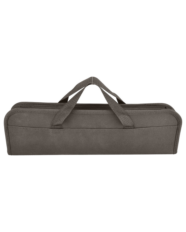 This stainless steel utensil set includes a spatula, fork, and tongs, all packed in a durable 600D polyester zippered case. The case features handles and a front open pocket for added convenience. Product size: 15.74" w x 4.75" h x 2" d.