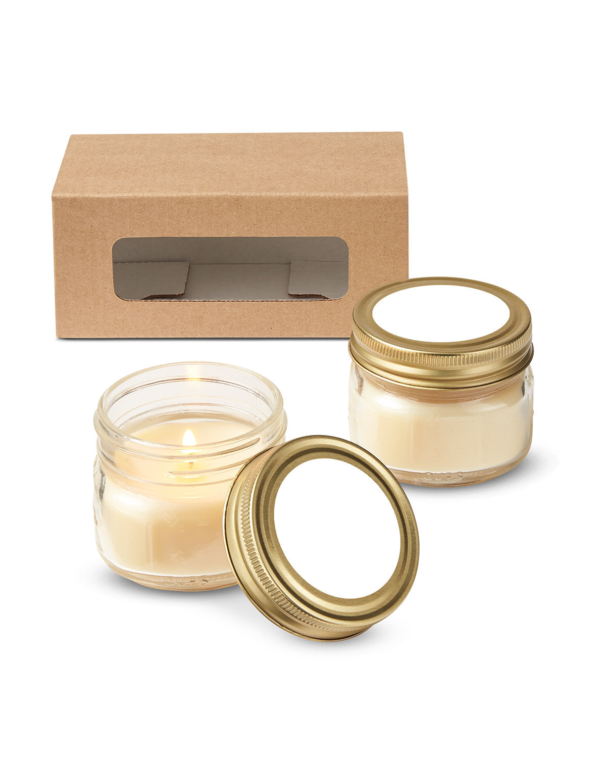 Made of Wax and Glass; Set of two wax candles, each in a 3 oz. glass jar with a gold lid;