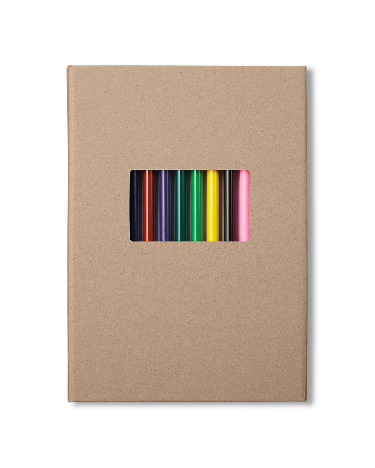 Includes 10 wood colored pencils secured with black elastic and one wood pencil sharpener;