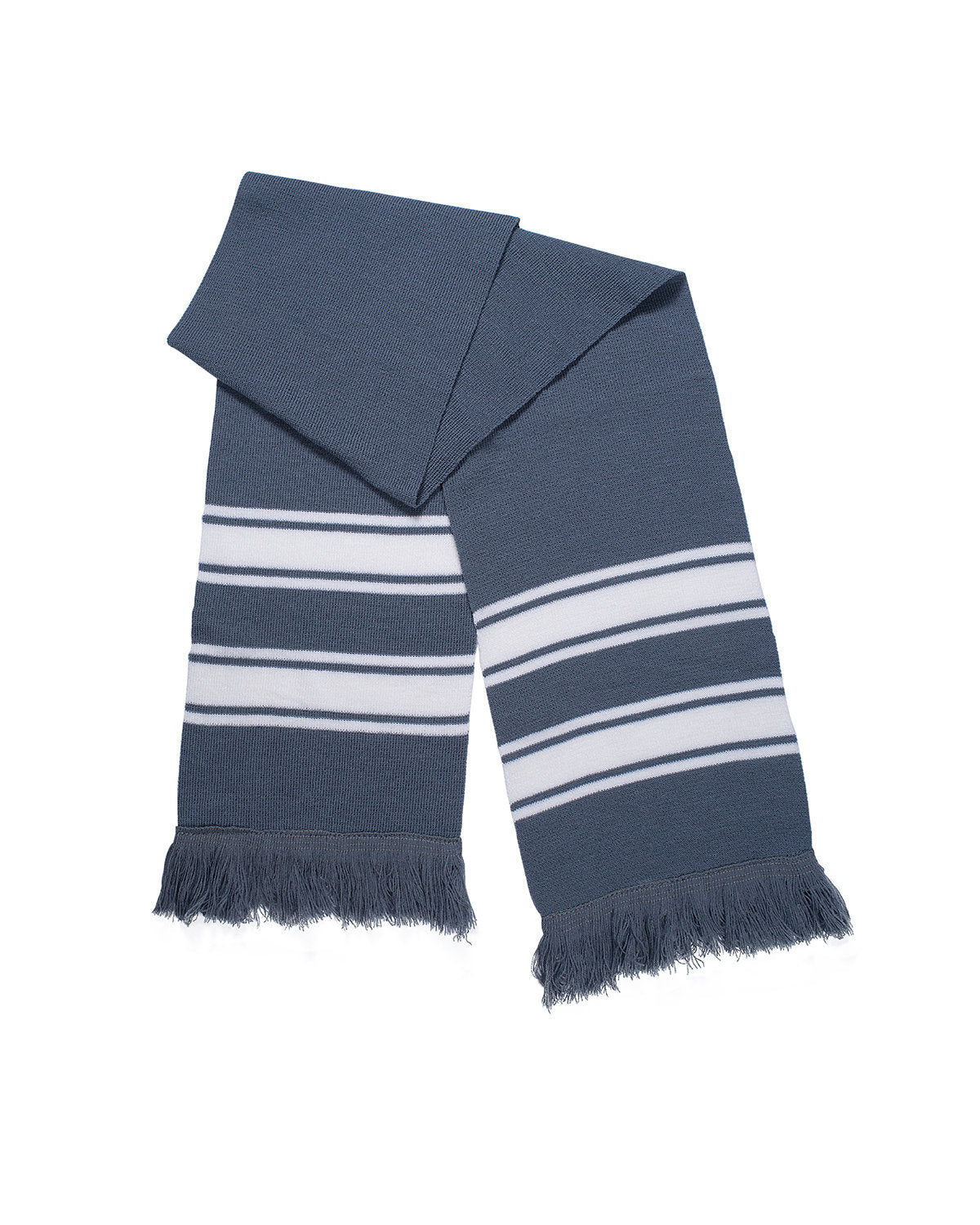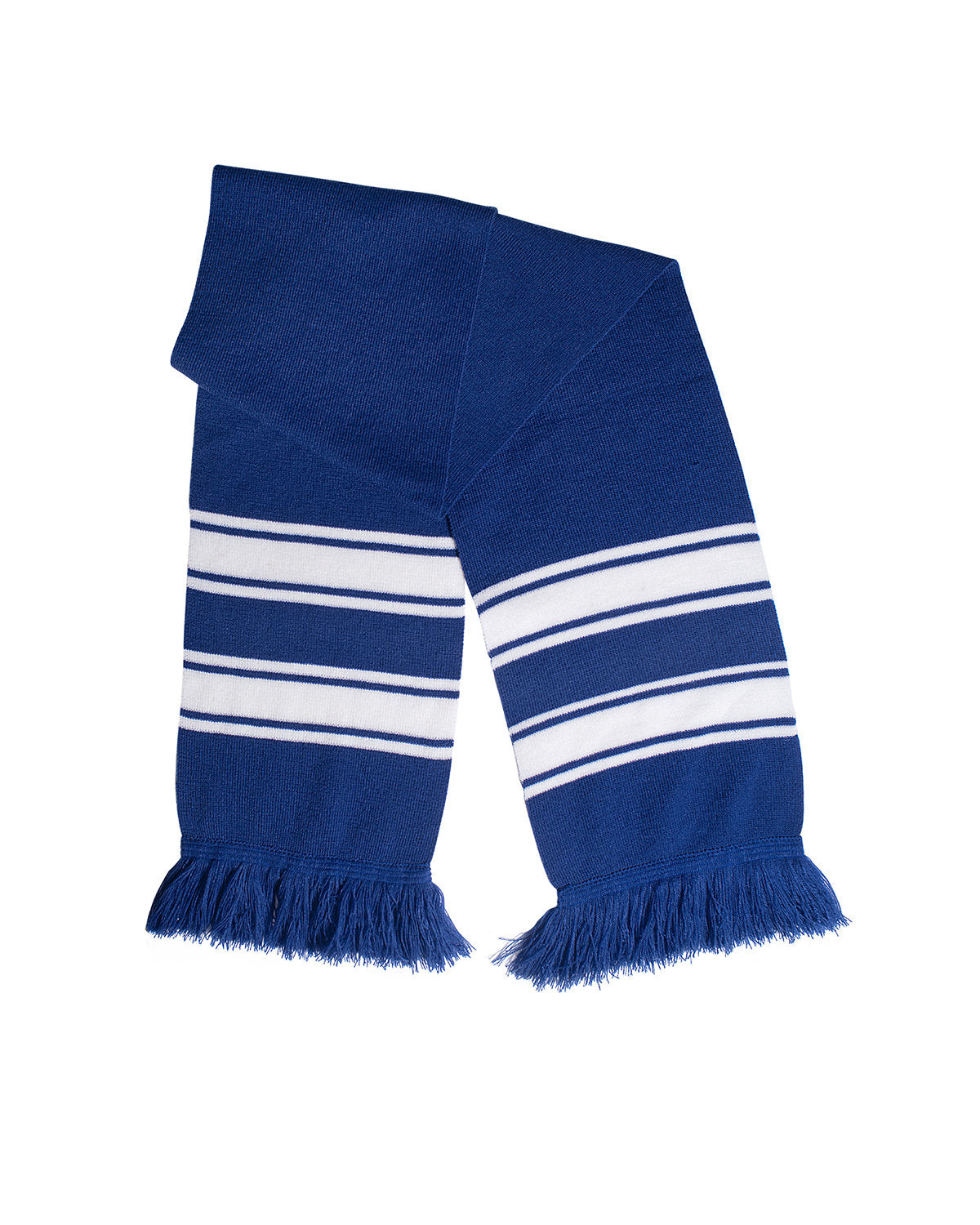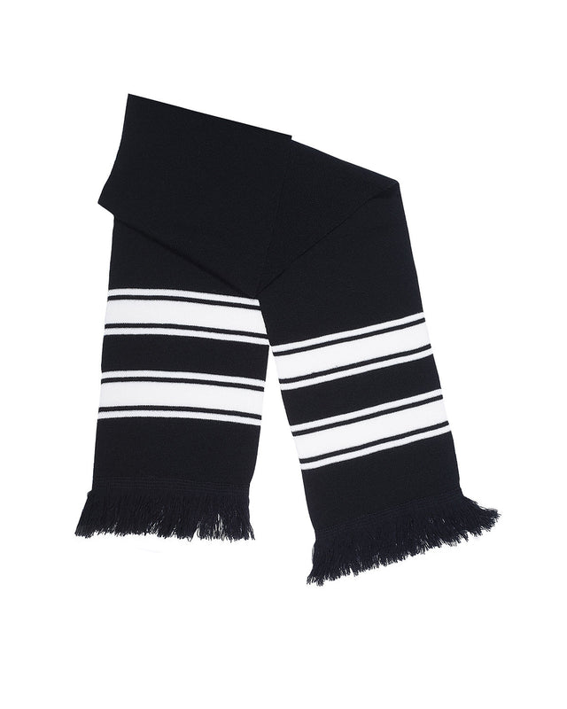 Description: A cozy acrylic knit scarf featuring stylish white accent stripes and fringed edges for a classic winter look.