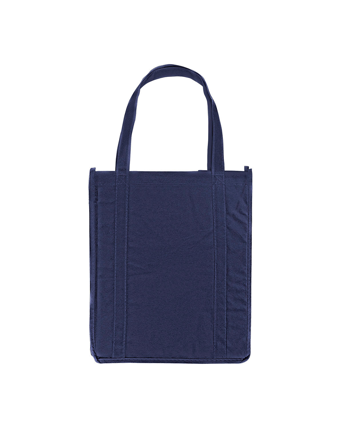 Description: A compact and eco-friendly reusable market or grocery tote made from 80 GSM non-woven polypropylene with 2%-10% post-consumer recycled content. Features a spacious open design with a box gusset and removable rigid bottom insert for added durability.