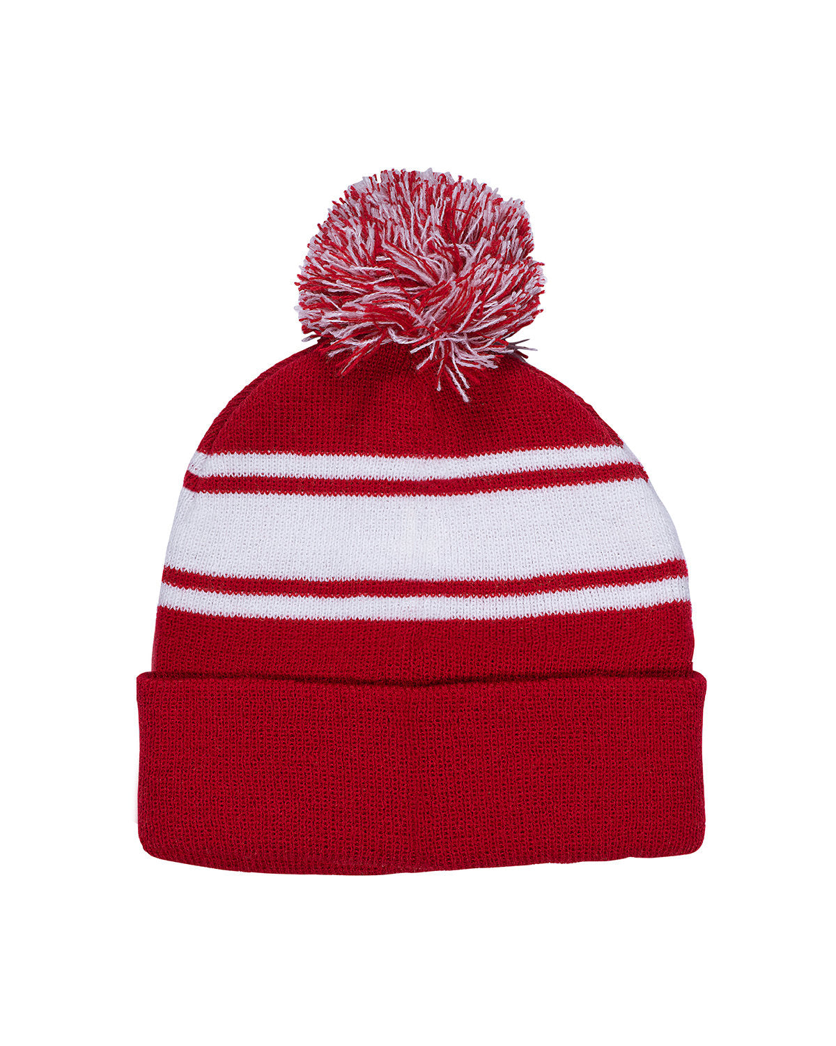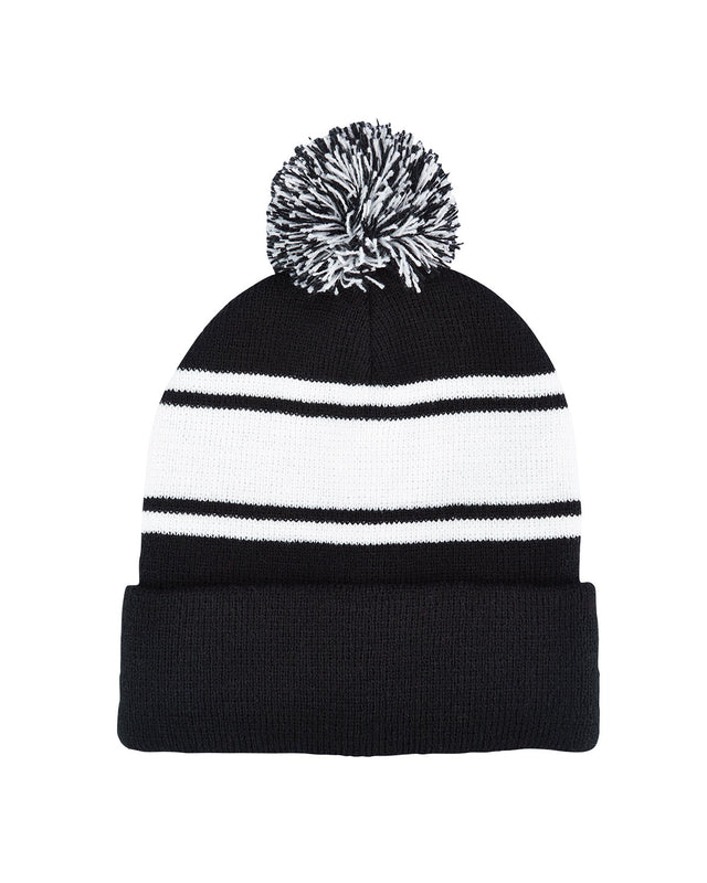 - Design: Two-tone pom pom on top, with colors that match the beanie body and stripe accents.