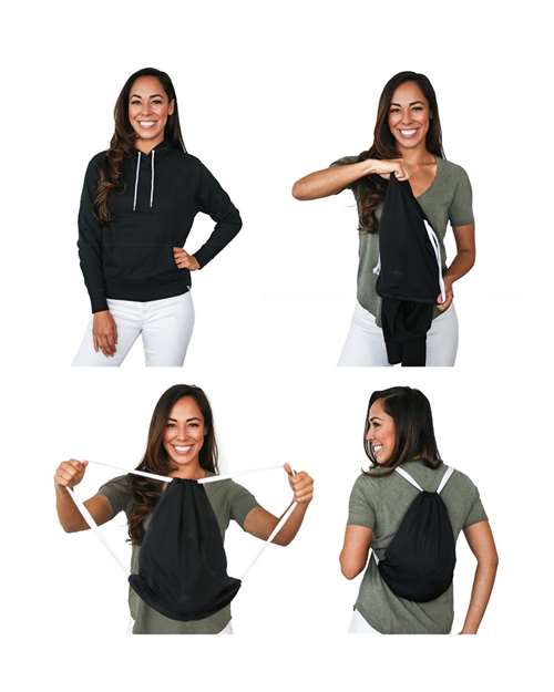 - Patented 2-in-1 hoodie converts into functional drawcord backpack in seconds