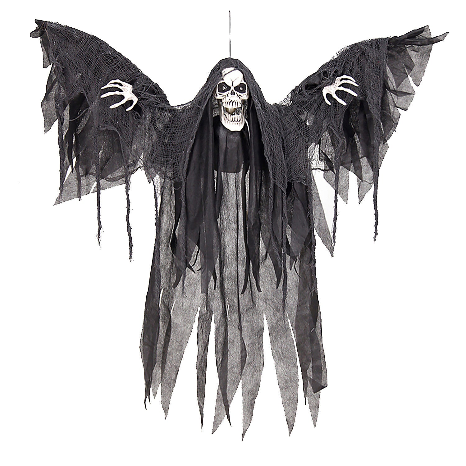 This winged reaper is ready to swoop down and scare trick-or-treaters! This scary prop will look frightfully fantastic hanging from your porch or tree in all of its creepy glory! A great pick for haunted houses or Halloween parties, this flying reaper moves when activated and will delight guests of all ages.