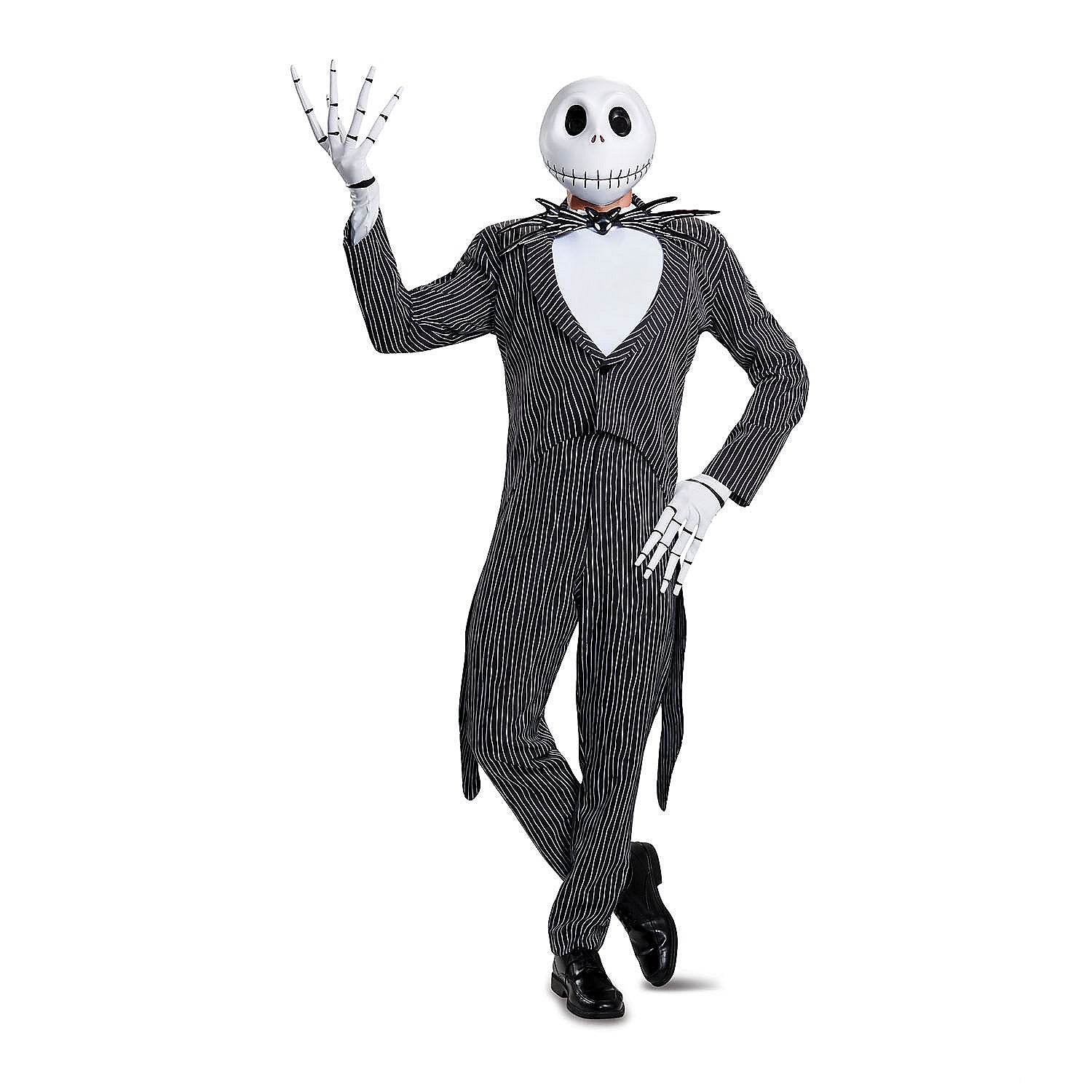 Transform into the iconic character with our Adults Prestige Jack Skellington Costume from Disney's The Nightmare Before Christmas. This stunning outfit features a black pin-striped jacket with ragged tails, matching pants, a padded white dickie shirtfront, a vinyl batwing bow tie, long-fingered skeleton gloves, and a full vinyl character mask to complete your spooky look.