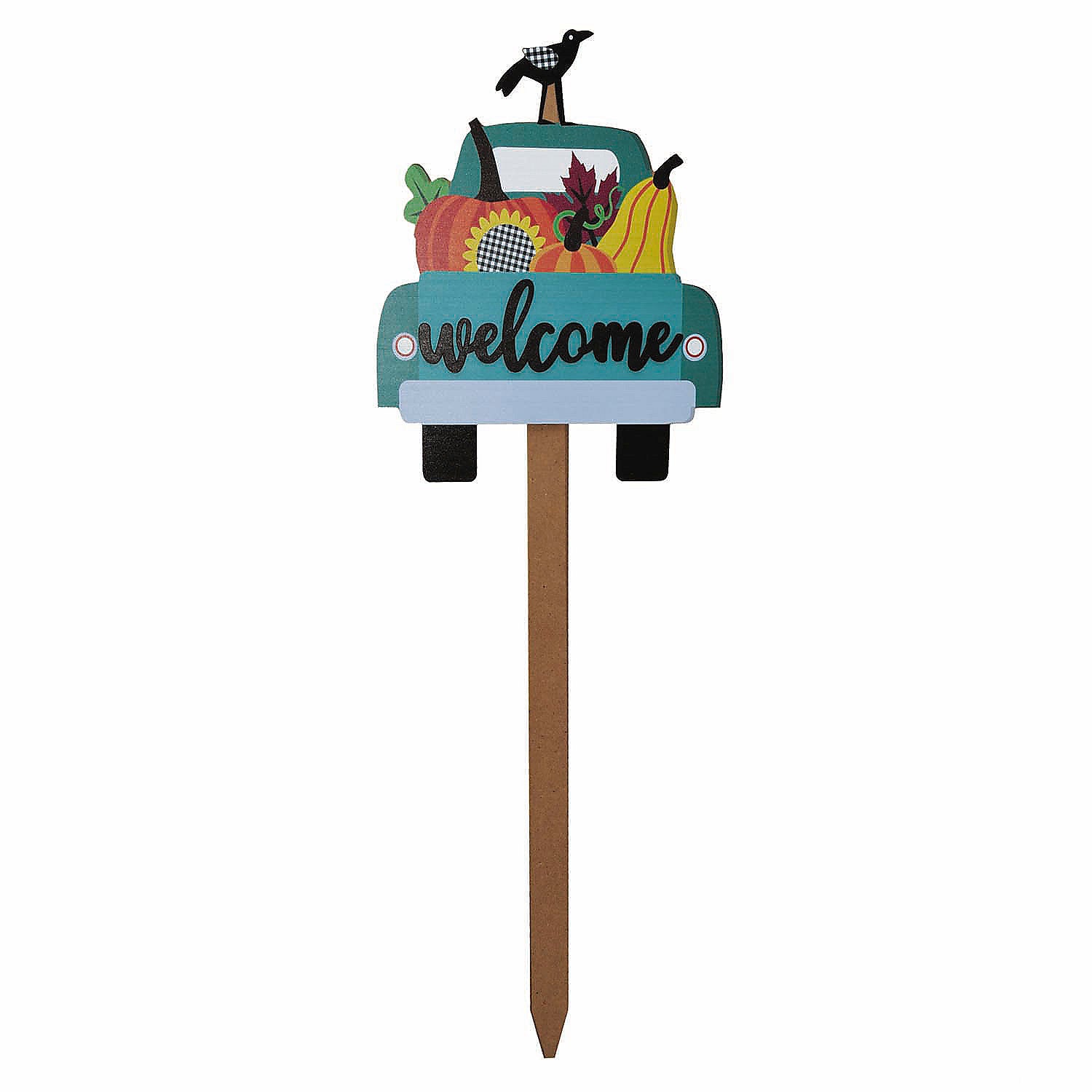 Add this fun yard stake to your yard decor this fall! Our 43" Welcome Yard Stake has a pickup truck bed overflowing with autumn harvest of pumpkins and flowers. Cheerful and cute addition to your autumn yard decor! Sign Size 8 1/2" W x 13 1/4" H. Stake Size: 30" Tall. Total height is 43 1/4".