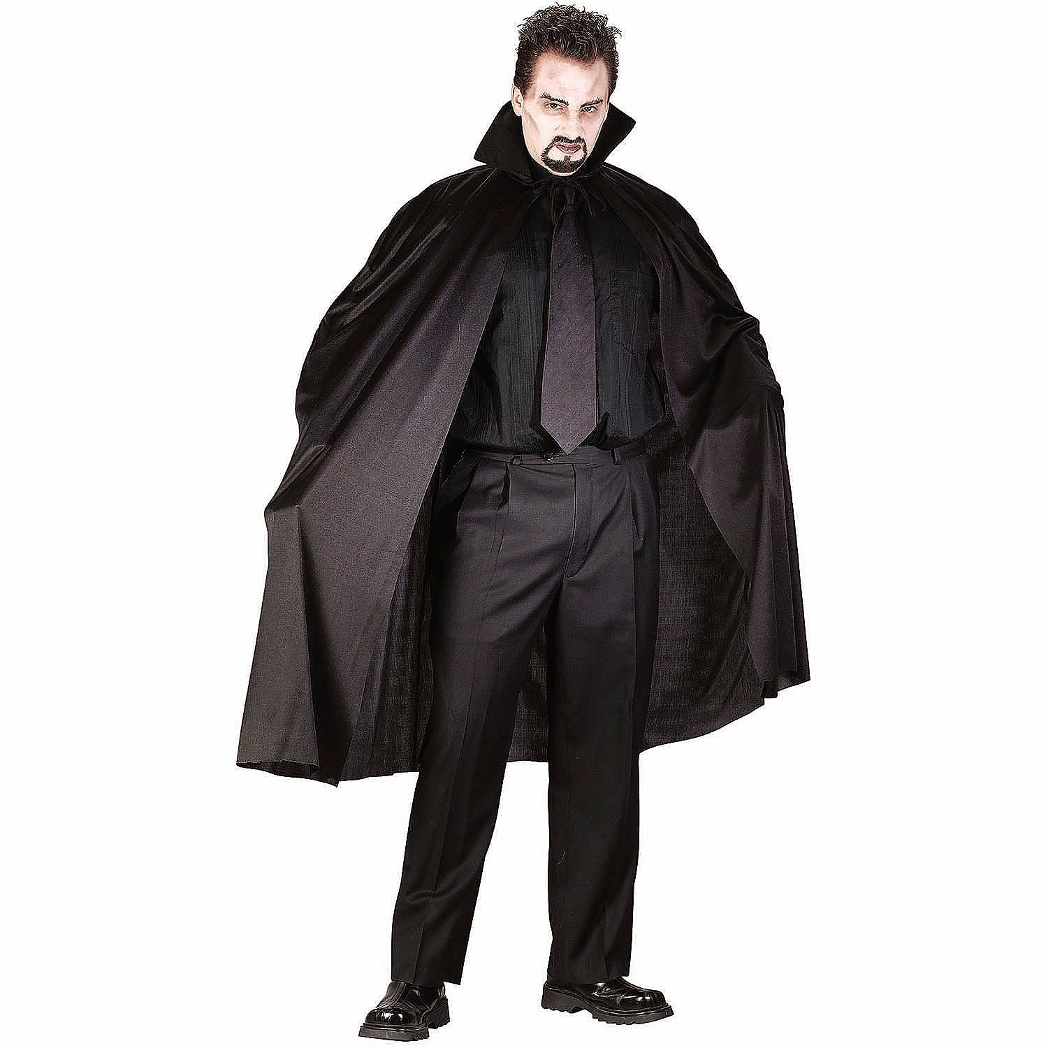 Here's a good basic cape to finish off many costumes! Our 45-inch Black Cape with a Stand-Up Collar features a tie closure at the neck and has a full flowing drape. Unisex styling makes it perfect for anyone looking to add a dramatic flair to their outfit. This cape fits women sizes 4-14, and everyone up to 6 ft, 200 lbs.