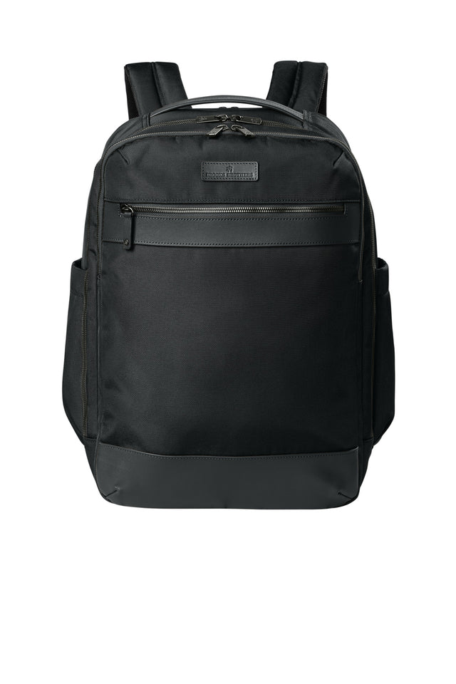 Travel in style and stay organized with the Brooks Brothers® Oxford Backpack, designed for everyday commuting or travel. Crafted from 500D x 750D polyester with knitted backing and 420D polyester lining, this backpack features genuine leather trim and details. It includes a front zippered pocket with leather pull, main compartment with interior mesh and slip pockets, a dedicated padded laptop compartment, zippered front office compartment, side pockets with elastic gussets, leather top handle, ergonomic padded shoulder straps, padded mesh back, leather feet, and trolley pass-through. Metal zipper pulls and exterior debossed leather logo complete the premium look.