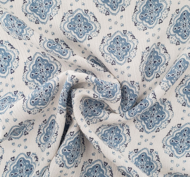 This Rayon Crinkle Crepon Fabric in Denim Blue is a lightweight, woven textile with a stylish crinkled texture. Made from 100% rayon, it measures 50/52 inches in width and drapes effortlessly, making it ideal for flowing dresses, skirts, blouses, and fashion accessories. Its soft feel and breathable nature make it perfect for warm-weather apparel and elegant silhouettes.