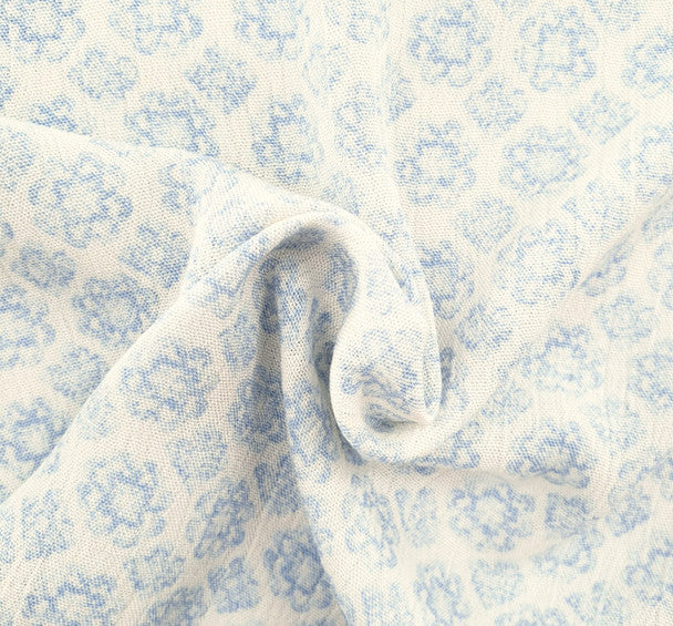 • Features an elegant off-white and blue pattern on a uniquely textured crepon base, adding a touch of vintage-inspired charm to your creative sewing projects.