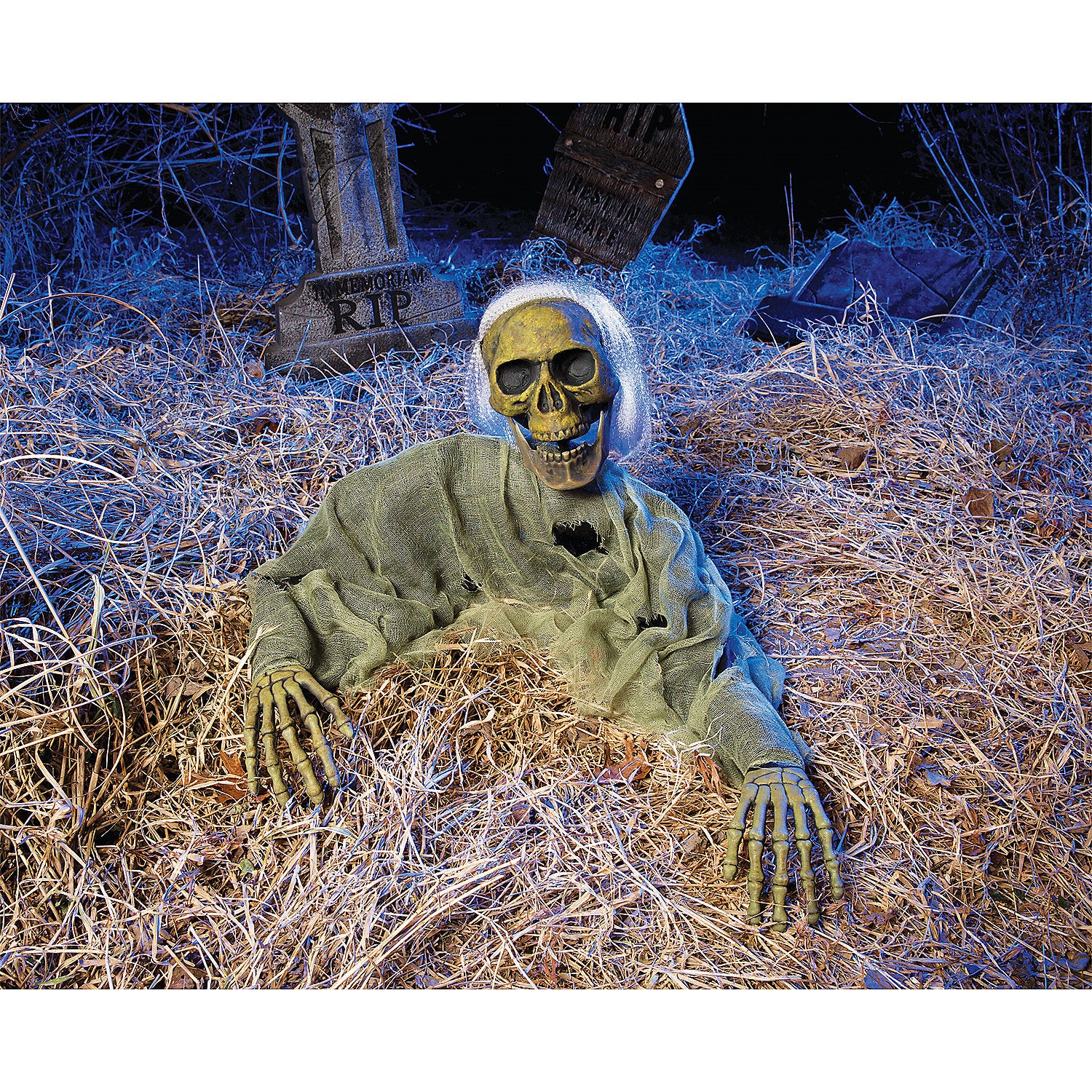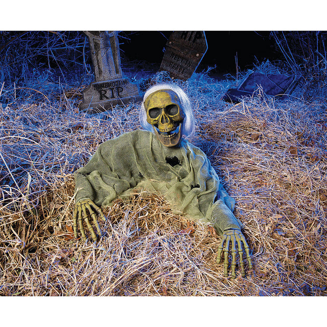 Get ready to jump out of your skin with this Skeleton Grave Breaker Lawn Ornament. A plastic skeleton with a spattering of disheveled hair draped in a cloth and mesh fabric to resemble a degrading shirt. The two arms are posable and can be put into a position best suited for their placement in your display.