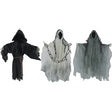 This hanging reaper is sure to mesmerize your victims at your haunted house or home haunt unlike anything before! Halloween decor set of 3 Hanging Faceless Reapers. You get one in black, one in gray, and one in white. Each reaper measures 21 inches long, making them perfect for adding an eerie touch to any Halloween display.