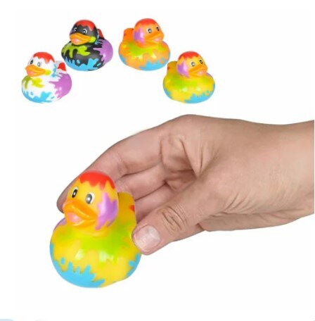 - Includes: Set of 4 Paint Splatter Rubber Ducks
