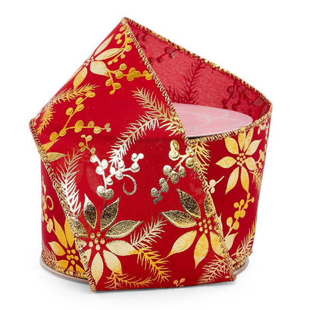 Christmas Poinsettias & Berries On Wired Ribbon 2 1/2 '' x 10 yd Red / Gold Embossed Color 1 / ROLL