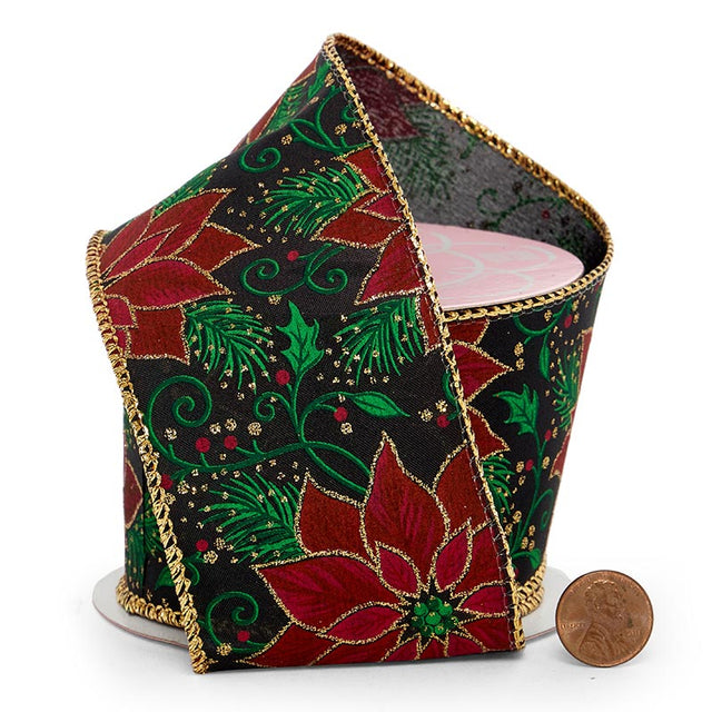 Christmas Poinsettias & Berries On Wired Ribbon 2 1/2 '' x 10 yd Black Satin Color 1 / ROLL