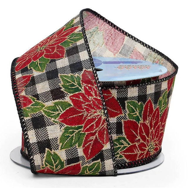 Christmas Poinsettias & Berries On Wired Ribbon 2 1/2 '' x 10 yd Poinsettia On Navy Gingham Color 1 / ROLL