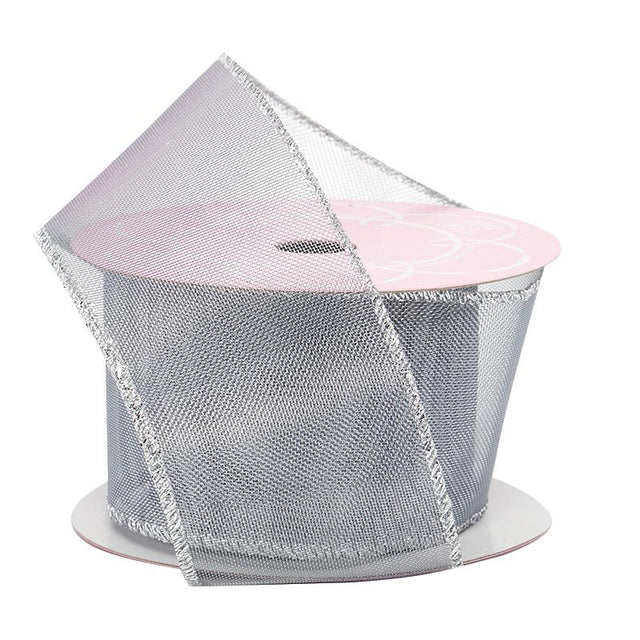 The Fine Mesh Metallic Wired Ribbon in Silver adds a touch of elegance and texture to your packaging and decorations. This 2-1/2" wide, double-faced ribbon features a fine mesh weave with a sturdy yet semi-sheer finish, and its wired edges ensure easy shaping for bows and other creative projects.