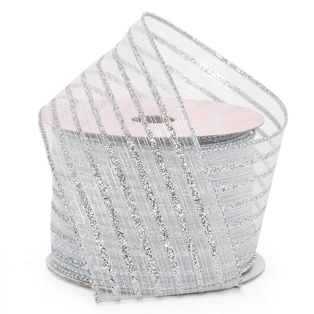 Glitter Stripes On Sheer Wired Ribbon 2 1/2 '' X 10 yd Silver Color 1 / ROLL