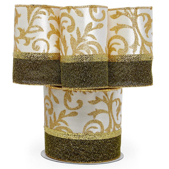 - 4" wide, 10-yard roll of White/Gold Extra Wide Florence Christmas Wired Ribbon.