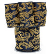 - 4" wide ribbon with a luxurious Florentine pattern in gold and navy.