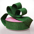 Fine Linen Ribbon in green offers a natural, casual look with a soft, linen-like texture. This 1 1/2 inch wide and 25-yard long ribbon is made from specially processed polyester, dyed solid green on both sides, and features wired edges for easy shaping.
