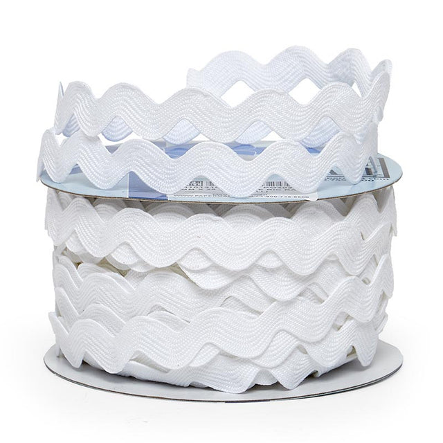 Large Ric Rac Trim in white offers a bold, wave-like pattern. This 11mm wide, 25-yard trim is perfect for adding texture and style to a variety of craft projects, sewing, and home décor.