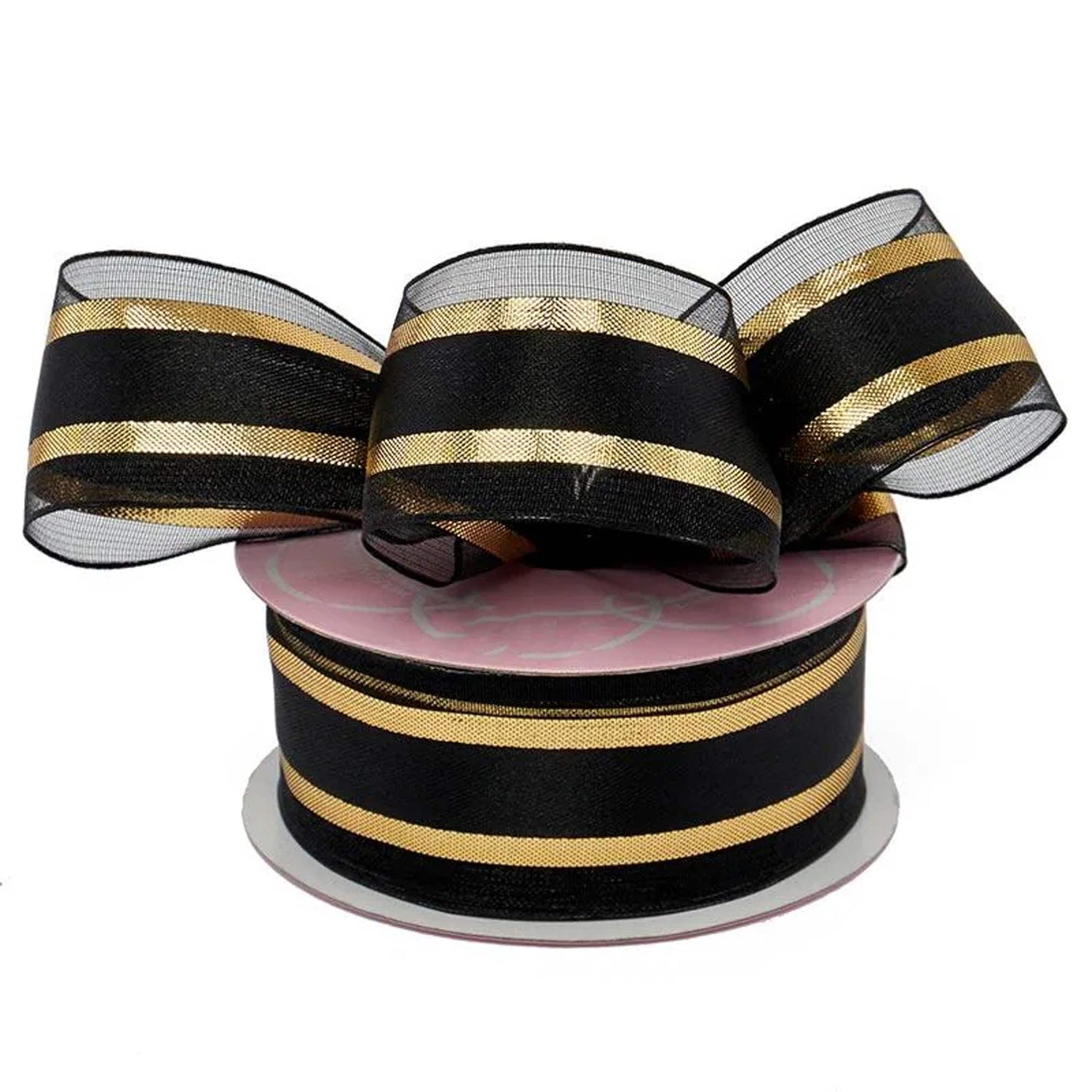 - 1 1/2" wide and 25 yards long with a black satin center and gold accents.