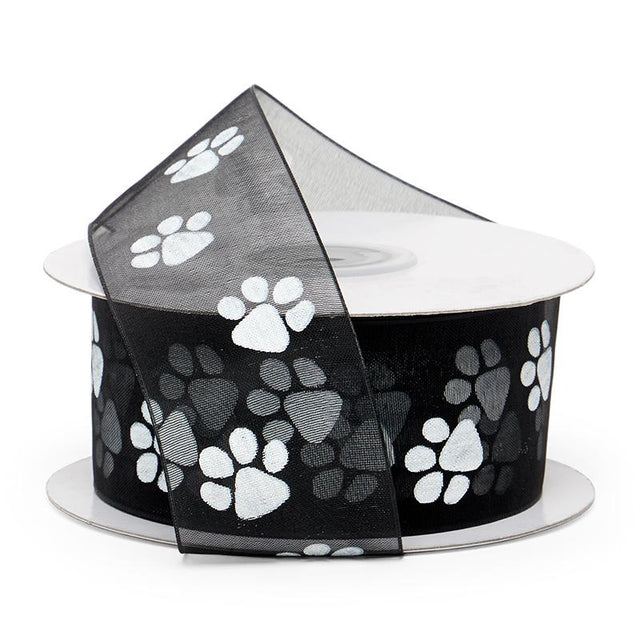 Paw Print Organza Ribbon in Black features a sheer fabric with playful paw print designs, perfect for pet-themed crafts, gift wrapping, or accessories. This 1 1/2-inch wide, 25-yard roll adds a fun, pet-friendly touch to your creations.