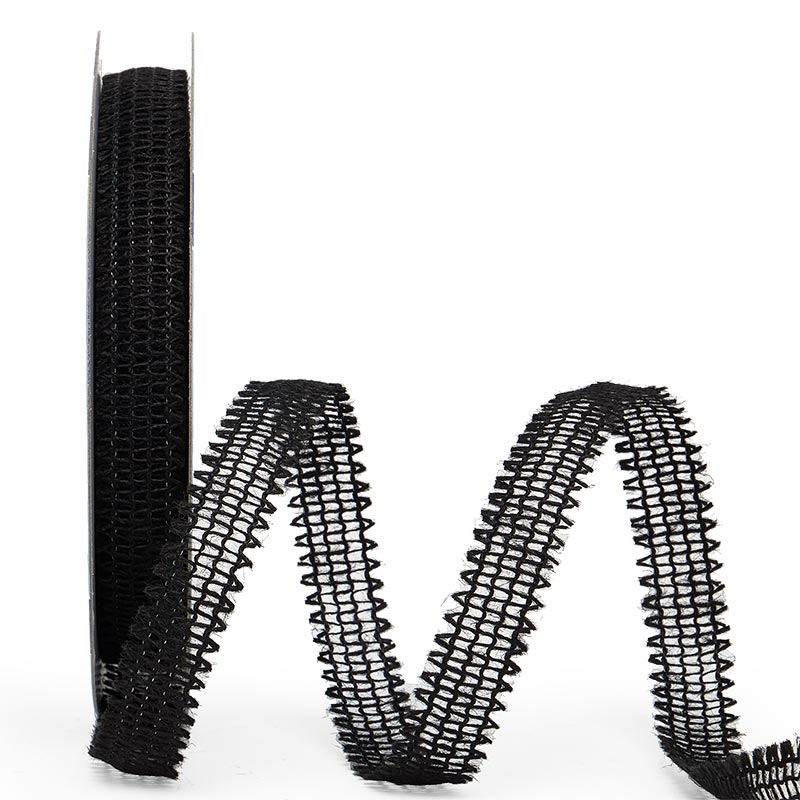 - 7/8" wired burlap ribbon in Black with ragged edges.