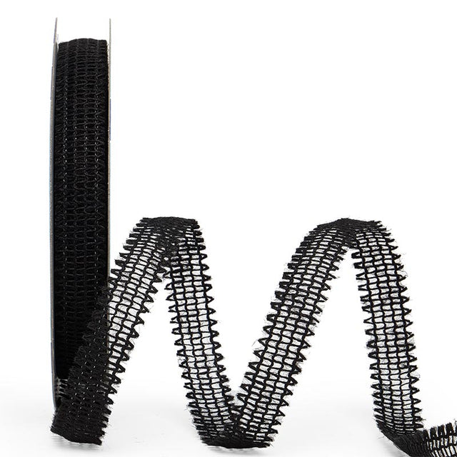 This Ragged Edge Wired Burlap Ribbon in Black is a natural, open-weave ribbon that measures 7/8" in width and features a wired construction for easy styling. The ribbon’s loosely woven mesh creates a rustic texture, while the unfinished edges add a touch of roughness, making it perfect for rustic-themed projects, natural bows, or home decor. Made of 90% Jute and 10% Nylon, this ribbon is both durable and versatile.