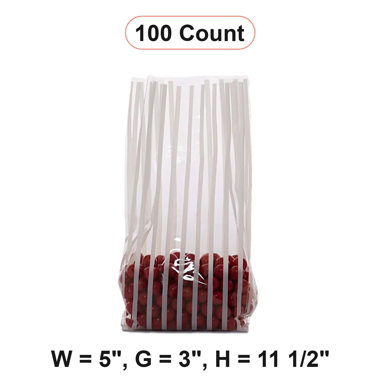 Package your small items with classic style using these 1.2 mil cello bags. Made of clear polypropylene, they feature a gusseted side, back weld seams, and a bold stripe-patterned exterior—ideal for retail display, party décor, or candy packaging.