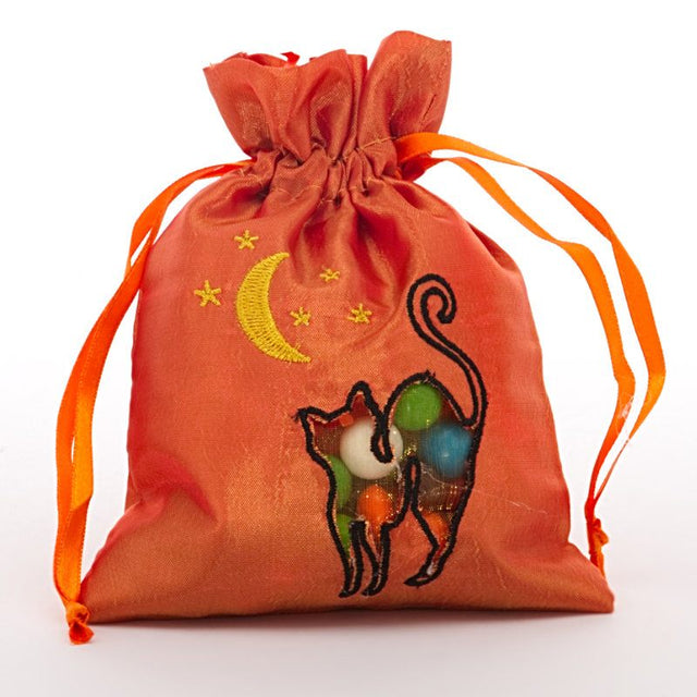 These Halloween Taffeta bags are festive pouches perfect for trick-or-treating or seasonal gift packaging. Made from shiny taffeta, each bag features a sheer fabric window to showcase the contents inside. The designs are outlined with bold embroidered edges for an eye-catching look.