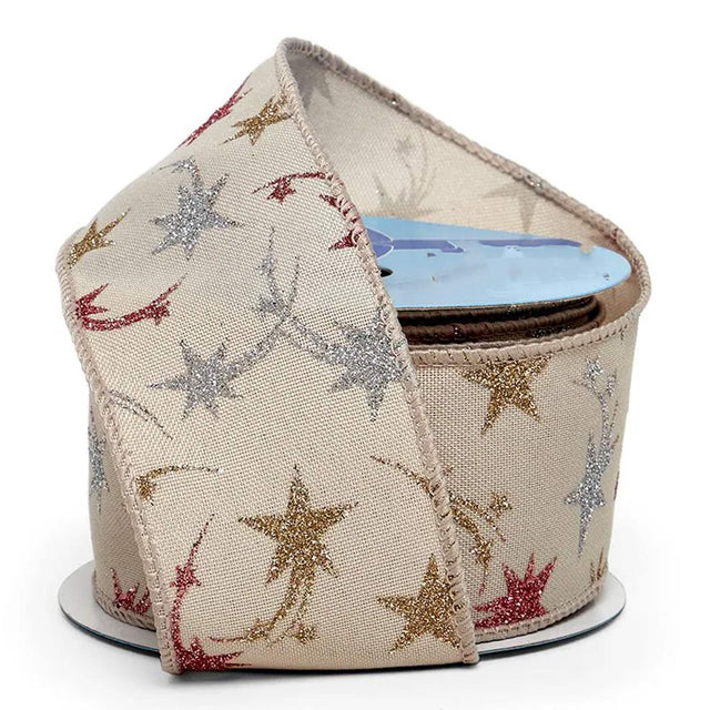 Glitter Stars on Wired Ribbon is a decorative accent perfect for adding sparkle to gifts and crafts. With its shimmering star design and structured wired edges, this 2 1/2 inch ribbon offers both style and versatility.