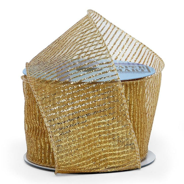 Gold Sheer Metallic Glitter Stripes on Wired Ribbon – 2.5" x 10 Yards (1 Roll)