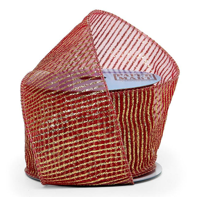 Gold/Red (Sheer) Metallic Glitter Stripes on Wired Ribbon – 2.5" x 10 Yards (1 Roll)