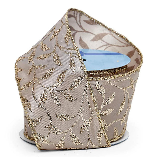 Sparkly Leaves On Wired Ribbon 2 1/2 '' X 10 yd Light Gold Color 1 / roll