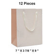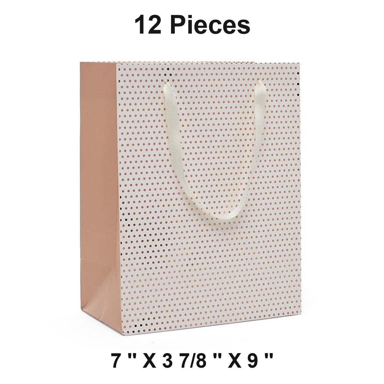 These Metallic Dots Euro Totes feature a sleek white background adorned with elegant rose gold dots, offering a modern and stylish presentation for any gift. Measuring 7 inches by 3 7/8 inches by 9 inches, these totes are perfect for medium-sized gifts. Each bag includes soft ribbon handles for a luxurious touch and added convenience. This package includes 12 high-quality totes, making them ideal for holiday gifting, parties, or retail use.