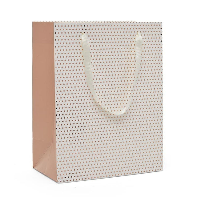 Metallic Dots Euro Totes with Ribbon Handles 7''x 3 7/8 ''x 9'' White / Rose Gold - 12 each / package - 12 PCS is backordered and will ship as soon as it is back in stock.