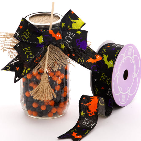 Black Boo Halloween Wired Ribbon 1 1/2 '' x 10 yd - 1 / ROLL