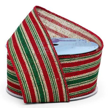 Striped Faux Burlap Wired Ribbon 2 1/2 '' X 10 yd Green / Red Color 1 / roll
