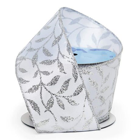 Sparkly Leaves On Wired Ribbon 2 1/2 '' X 10 yd Silver Color 1 / roll