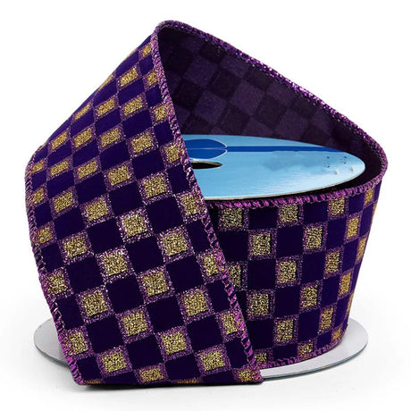 Sparkling Checkered Print On Velvet Wired Ribbon 2 1/2 '' X 10 yd Gold / Purple Color 1 / roll