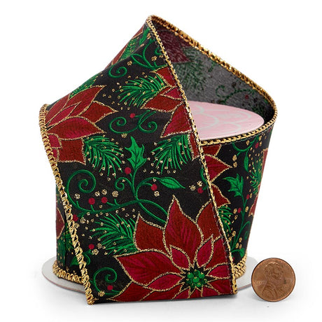 Christmas Poinsettias & Berries On Wired Ribbon 2 1/2 '' x 10 yd Black Satin Color 1 / ROLL