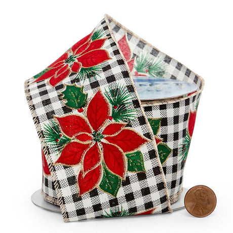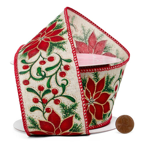 Christmas Poinsettias & Berries On Wired Ribbon 2 1/2 '' x 10 yd Poinsettias & Holly Color 1 / ROLL