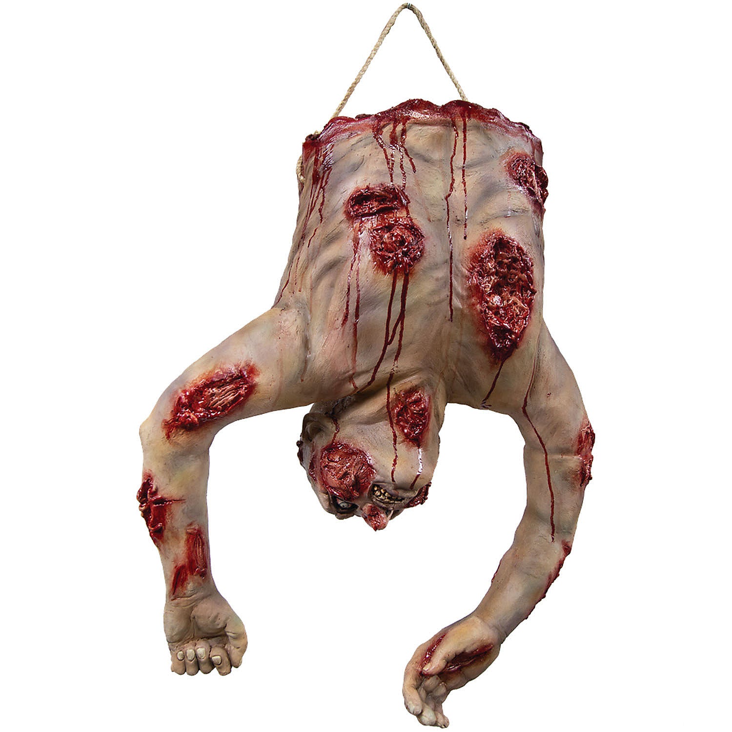 Add a spine-chilling touch to your Halloween celebrations with our Hanging Corpse Prop. This gruesome half torso hangs upside down, featuring bloody wounds and a tortured grimace. Perfect for haunted scenes, it creates an unsettling atmosphere sure to scare your guests!