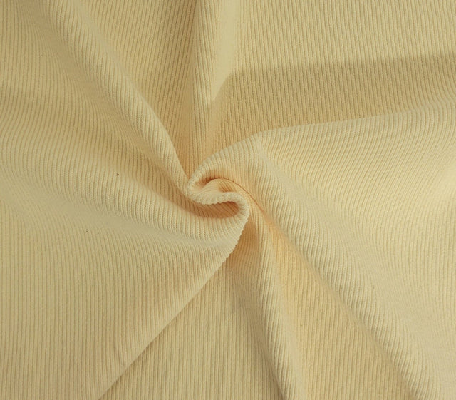 This banana yellow cotton spandex 1x1 rib knit fabric offers excellent stretch and texture, perfect for coordinating with matching French terry for stylish activewear. The cotton blend delivers softness and breathability, while spandex adds four way stretch for comfortable movement. Its vibrant yellow color brightens casual wear, making it ideal for cuffs, waistbands, and layering pieces. Designed for durability and ease of sewing, this rib knit fabric enhances joggers, hoodies, and loungewear projects.