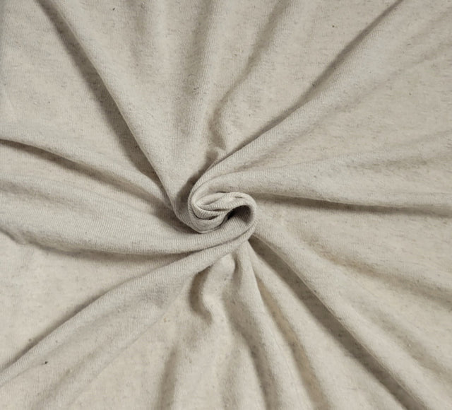 This Natural Linen Cotton 1x1 Rib Knit is a lightweight and breathable stretch fabric perfect for layering basics and loungewear. Made from a blend of natural fibers, it offers a subtle texture with excellent breathability and softness. The ribbed construction provides gentle stretch and recovery, making it ideal for form fitting garments. Its neutral tone and versatility make it a favorite for year round apparel and accessories.