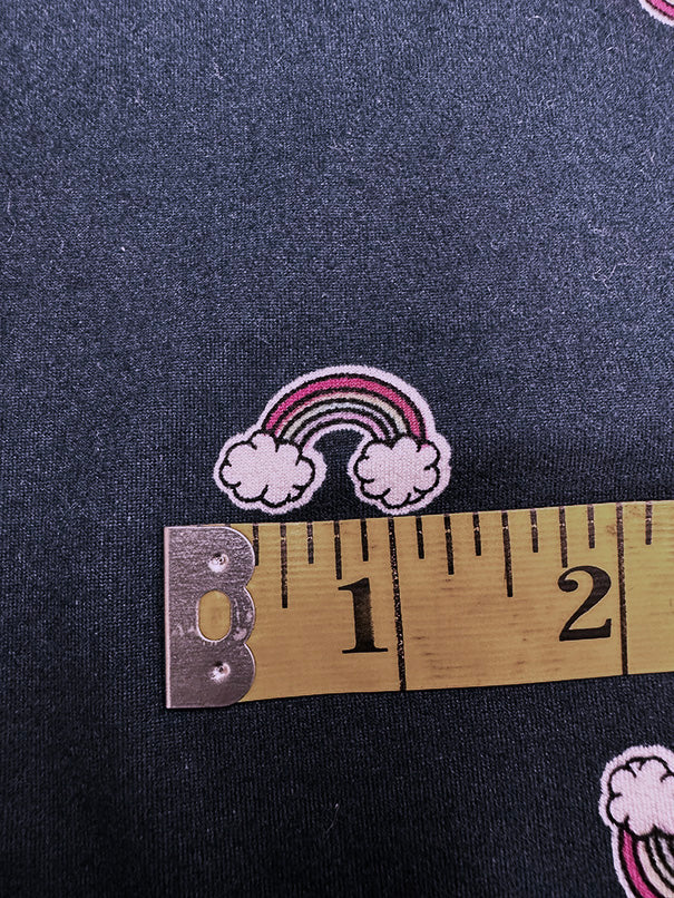 1 Yard of vibrant rainbow print in Black, White, Pink, Yellow, Green, and Purple on a navy blue background. This light-weight double brushed jersey knit fabric offers a soft hand, horizontal stretch, and good drape. Made from 96% polyester and 4% spandex, it’s ideal for apparel, activewear, blouses, dancewear, pajamas, and casual tops. Features a 9 1/2" horizontal repeat and 8 1/2" vertical repeat.